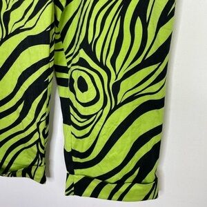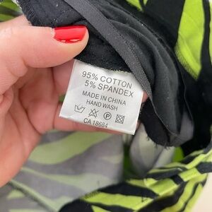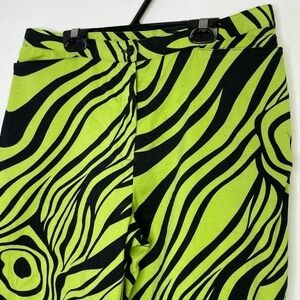 In good condition except the charm zipper is broken. 95% cotton 5% spandex. Cropped length if you're petite. Straight leg with fold bottom. Cool quirky print. Measure lay flat: waist 16'' hips 20'' rise 12'' inseam 19'' bottom wide 9''.