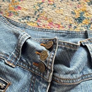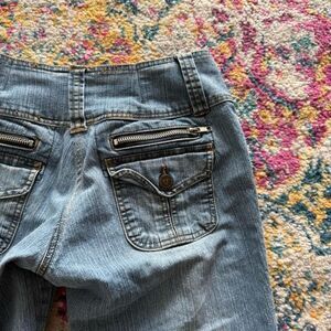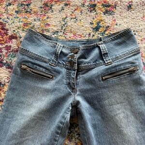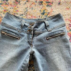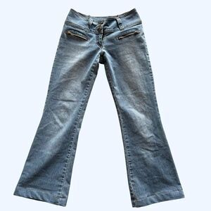 Y2K seduction low rise light was cropped flared leg jeans low rise zipper trim grunge denim Good condition Super sick Waistband 13’ Inseam 30’ Front rise 9’