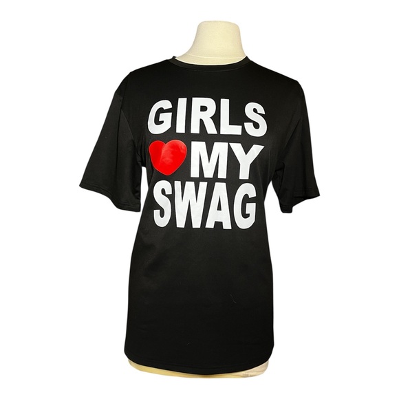 Trendy black t-shirt with a vibrant red heart and bold white text.