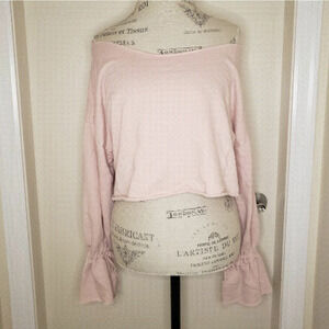 Light pink wide off the shoulder boat neck long adjustable bow tie poet sleeve sweater top with raw hems, by Mossimo.
