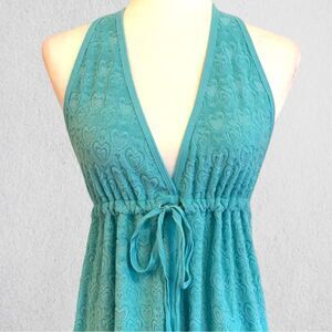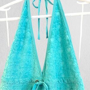 Very Y2K swim cover/ dress! Turquoise mini halter dress made from terry cloth with embedded heart print. Open back, draw string around the neck and under the bust, also has pockets! This style would be very Lizzy Maguire or Olsen Twins Y2K with platform flip flops and blue tinted sunglasses. Size large. It fits medium/large. Very adjustable and the back is elastic. Excellent condition.