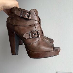 Y2k Grunge Leather brown platform heelds with open toe and buckle trim by Miss S