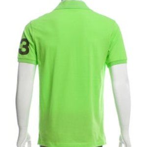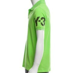 Men's lime green Y-3 for Adidas logo print polo shirt with spread collar, short sleeves and button closures at front.