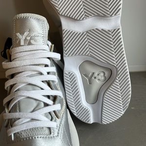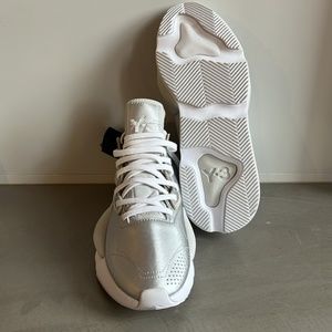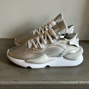 The Kaiwa sneakers from Y-3 are made with a mix of synthetic leather and textile materials in a Silver Metallic, and feature a platform rubber sole, closed rounded toes with perforated detailing, a front lace-up, neoprene on the tongue and back, a white heel tab printed with a silver logo, leather and textile lining, a branded leather insole, and grey rubber midsoles engraved with the designer’s name.
