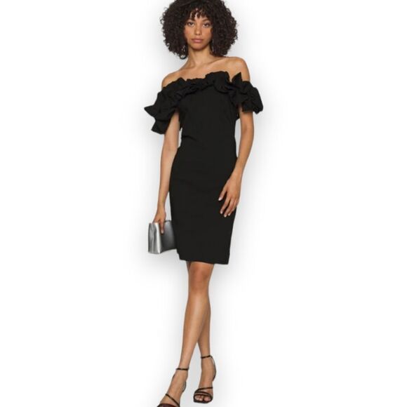 Dramatic YASCARRIE Black Off The Shoulder Ruffle Trim Mini Dress. Sheath Style Cut In A Slim Fit, Contoured Double Seam Work Throughout For Fit. Stretch Bodycon Fabric. There Is Non Slip Silicone Inner Trim At the Back and Bust To Keep Everything In Place. Invisible Side Zip Closure With Hook And Eye Loop. BNWT, No Flaws.