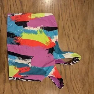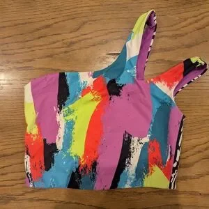 Vibrant abstract print top. Features bold colors and unique design. Perfect for a standout look.