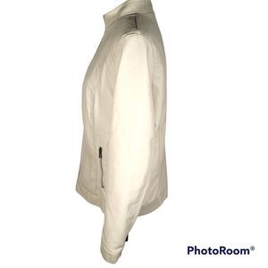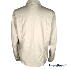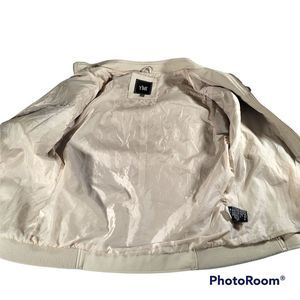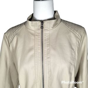 Buttery Soft. Tan faux leather light jacket/blazer can be dressed up or down. Moto detailing on shoulder. Excellent used condition(very, very mild pilling along wrist).