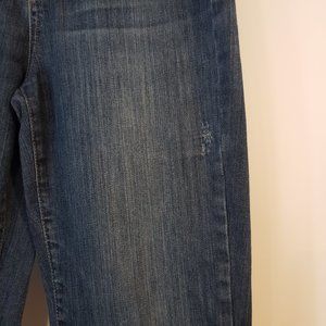 This slim jean is the perfect blue hue with its 5 pocket design and light distressing. The 30" inseam is a high-rise. Versatile jeans like these can be styled from day to night with ease.