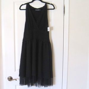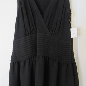 You You Collection sleeveless dress. Colour: Black.SIZE: M (size label indicates XL but fit is much smaller, armpit to armpit measures 14.75 inches) V-neck design, silk trim on neckline and sleeves. Knitted upper, lace skirt.Fully lined, sheer mesh underlay at skirt, horizontal pleats at waist. Hidden zipper closure on the side.Fabric Content: 70% rayon,15% chiffon of silk,15% polyamide. Dress is new with ticket and has never been worn.