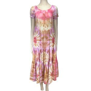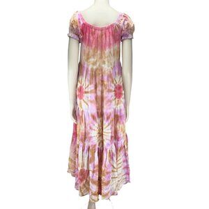 YOUNG FABULOUS & BROKE Tie-Dye Smocked Maxi Bohemian Boho Puffed sleeves Pink XS
