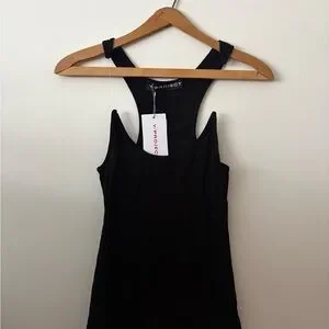 Sleek black ribbed tank with a fitted silhouette. Racerback design for a sporty, modern look. Soft, stretchy fabric for comfortable wear. Minimal neckline for easy layering or standalone styling.