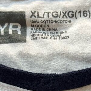 100 percent cotton material. Large striped YR tee for youth XL preteen child. In good used condition. Older teen outgrew it. Smoke-free home. Colours are burgundy, white and navy blue. Regular wash wear. Used item, so may have small imperfections.