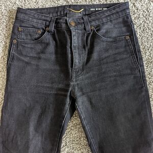 Saint Laurent black jeans, with a high rise fit, tapered leg and gold hardware. They are in well loved condition, with some fading around the inseam, and hem (pictured).