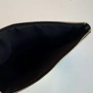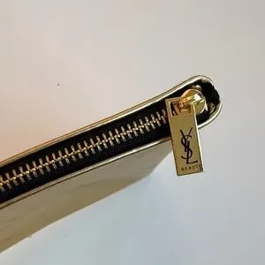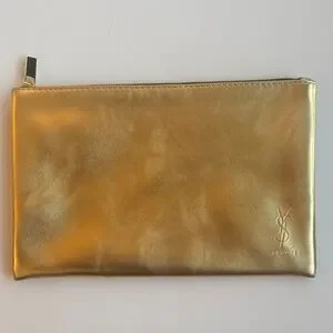 Elegant gold pouch with YSL logo. Perfect for cosmetics or essentials.