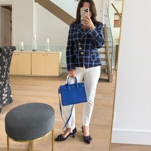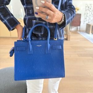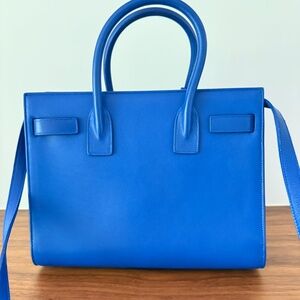 This iconic bag from YSL is in LIKE NEW Condition with some stickers still in place. This authentic SAINT LAURENT Calfskin Nano Sac De Jour is in royal blue. This mini tote is crafted of smooth calfskin leather. The bag features rolled leather top handles and an optional leather cross-body strap. The top is open to a compact suede interior with a patch pocket. Gold hardware