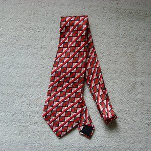 - Gorgeous silk YSL tie features a geometric pattern with colours of red, gold, olive green and black.