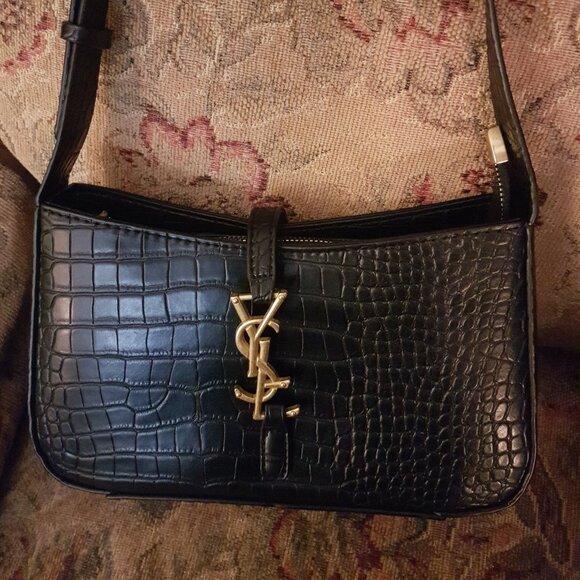 Chic black shoulder bag with croc-embrossed texture. Iconic YSL logo in gold. Perfect for stylish outings. Price reflects authenticity.. New