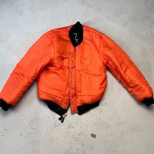 • Ultra-rare SAMIZDAT reversible bomber jacket featuring collaborative artwork with the iconic experimental group Psychic TV. This piece is both a collector’s item and a functional wardrobe staple, fully reversible with bold orange on one side and graphic black nylon on the other. Lightweight yet insulated, this jacket merges subversive punk energy with utility-driven design.