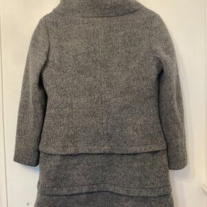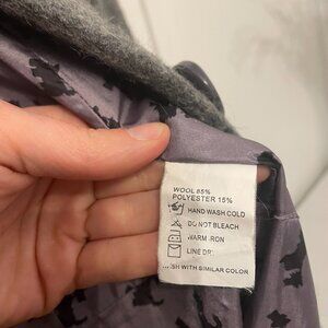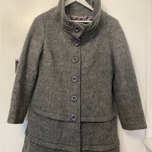Adorable lightweight dress coat from ultra-girly brand Yedina, with oversize purple buttons and tiered faux-ruffle hemlines. The best part is the Yorkie print lining!