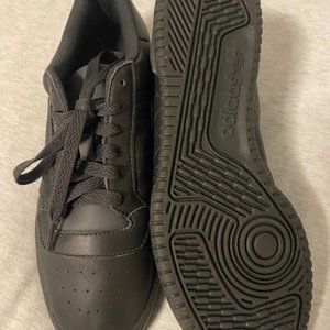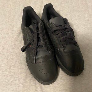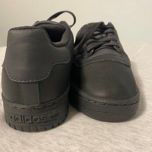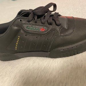 Designed by Kanye West, the Yeezy Powerphase Calabasas 'Core Black' is a minimalist take on adidas' Powerphase sneaker from the 80s. Dressed in an all-black leather upper with matching laces, the lateral side is accented by gold ‘Calabasas’ print and green 'adidas' text alongside a red Trefoil logo. A black EVA midsole and rubber outsole complete the look.
