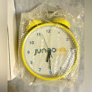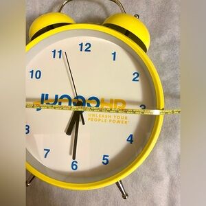 Bright yellow alarm clock with blue numbers. Features a classic twin bell design.