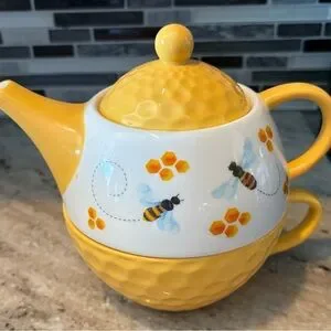 Charming bee-themed teapot and cup set in vibrant yellow. Perfect for adding a touch of whimsy to your kitchen.