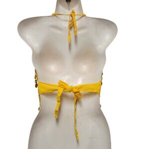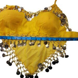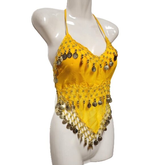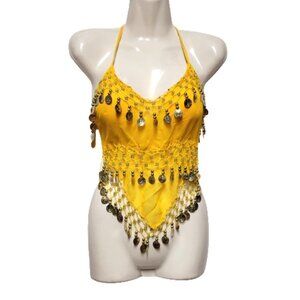 Yellow Belly Dancing Top Crocheted with Gold Beads Coins Halter Crop Top