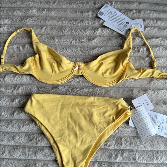 Brighten up your beach day with this stunning yellow bikini set. Perfect for a sunny day by the water.