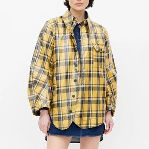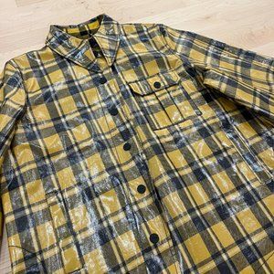 Ganni yellow and black plaid jacket featuring asymmetric snap fastening through the front. Also a ton of smaller details that really make this jacket stand out: a very cool pointed collar, branded snap button up front, two side pockets, one buttoned chest pocket, side slits at hem, and rounded hem. Inverted back box pleat. Outside fabric is coated and seems waterproof. Interior is entirely lined with soft check fabric, similar to flannel.