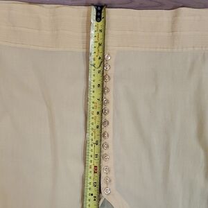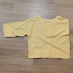Chic yellow blouse with button-up front. Features a stylish design with three-quarter sleeves. All buttons are intact. No rips, tears, holes, snags, or stains. Dimensions are in the photos since there is no tag for sizing. I would say it is an XL, or 2XL. I don't know what that would be in numbers.