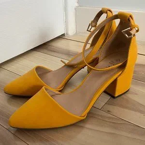 Yellow Call It Spring Low Block Heel with Ankle Strap, Pointed Toe and Metal Heel Detailing. Memory Foam sole provides extra comfort to these already amazing heels. Worn once.