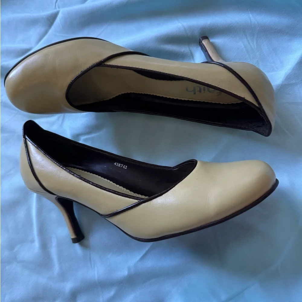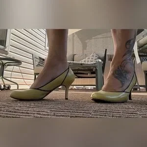 These yellow-colored heels feature a sleek design and a minimalist style, perfect for professional settings. Crafted with a smooth leather-like material, they offer a sophisticated look without any embellishments. The medium-height heel provides a comfortable lift, making them ideal for both office wear and formal occasions.