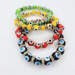 Vibrant colored Evil Eye Resin Beads Stretch Bracelet, alternating with shimmering, crystal rondelle spacers.