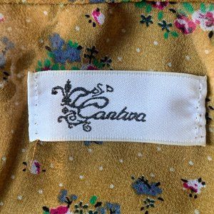Lightweight sheer fabric in a mustard yellow colour with floral pattern and lace collar