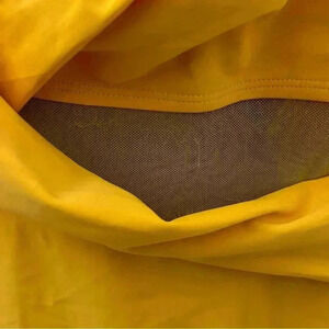 Yellow, lined bathing suit with cross-cross detail and mesh cut outs in front. Adjustable straps allow wearer to determine the fit. Mesh has some minor fraying (see picture). Size says 4XL, but fits similar to 2-3XL. Pls pay attention to measurements to ensure proper fit. 21” across bust, 20” under bust, 22” across stomach, when not stretched out.