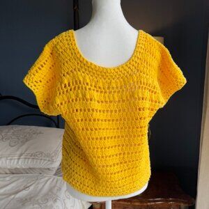 Yellow handmade open knit crochet sweater, scoop neck, short sleeves. Fits like a M-L, great condition. Bust measures 20 inches laying flat, sweater length is 22 inches. Cat friendly, nonsmoking home.