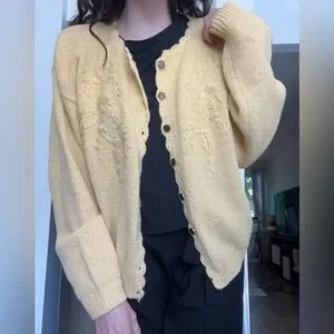 Oversized cozy yellow knit cardigan with black flower button-up front.