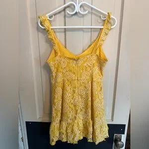 Bright yellow lace slip dress with delicate ruffle straps and hem. Floral lace overlay for a feminine look. Lightweight and breezy style. Perfect for summer events or layered outfits.