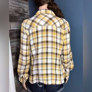 Stylish yellow plaid button-up top. Long sleeves. Perfect for casual wear.