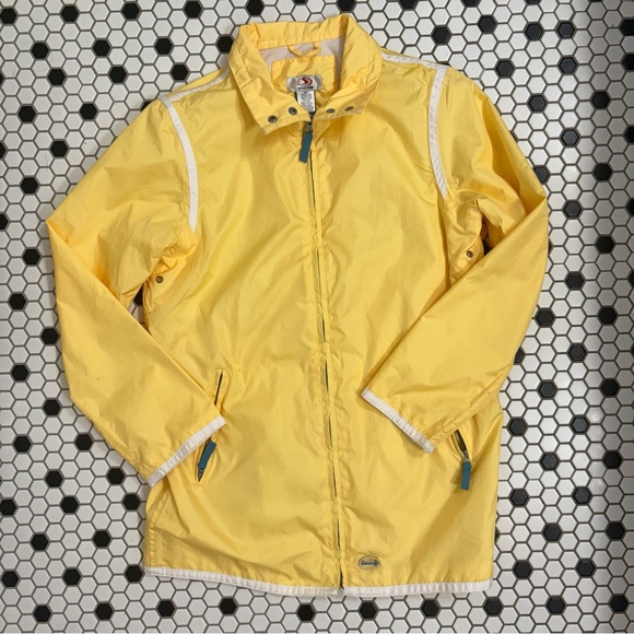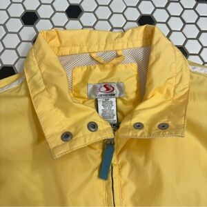 Lightweight waterproof yellow rain jacket from sport tek with mesh interior.
