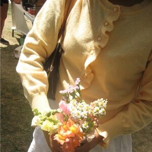 Charming yellow cardigan with ruffle details. Perfect for a cozy day out.