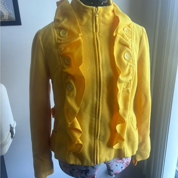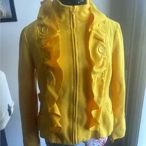 Brighten up your wardrobe with this vibrant yellow ruffled jacket. Perfect for adding a pop of color to any outfit.