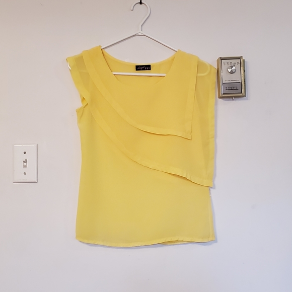 Yellow ruffles shirt.