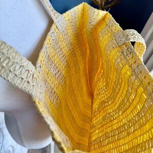 Hold your daily essentials in style with this Stripe Straw Crochet Tote Handbag from A New Day™. This fashionable tote handbag features an unstructured silhouette that's decorated with woven-texture crochet detailing with yellow and light beige stripes. The single main compartment helps keep your cellphone, wallet and more in one spot, while the double handle makes it easy to carry in hand or on your shoulder. Yellow and natural straw beige, measures 14.5 inches across by 15 inches tall, 3.25 inches wide, strap drop is 10 inches. Great used condition. Cat friendly, nonsmoking home.