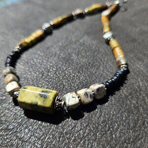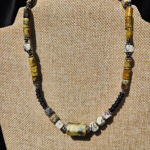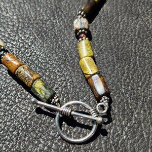 An earthy and unique necklace, featuring yellow turquoise, golden jasper, sandalwood and sterling silver. The statement toggle is an oversized sterling silver bar and loop toggle, and the focal bead is a stunning faceted barrel of yellow turquoise.