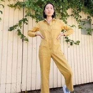 Tradlands yellow utility jumpsuit with front pockets and button-up design.