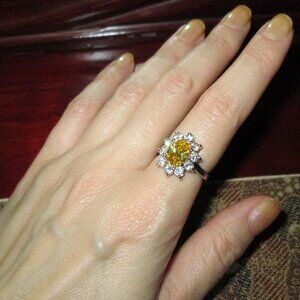 Yellow and clear cubic zirconia fashion ring. Silver plated metal alloy. Simulates Citrine and Diamond. Purchased 2008 and unworn.
