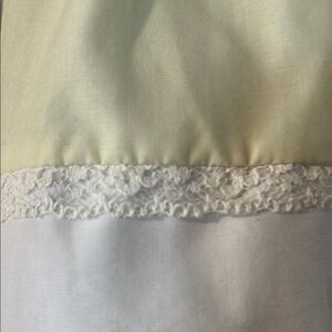 This charming vintage dress features a delicate smocked yoke with intricate detailing, complemented by short puffed sleeves for a vintage touch. The soft yellow fabric transitions into a white section, creating a subtle ombre effect that adds elegance to any outfit.