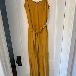 A beautiful warm yellow colour for a summer or autumn wedding. A belt and slit in front make it very flattering for everybody. Adjustable straps, lining in skirt and a delicate dotted pattern. Worn twice!