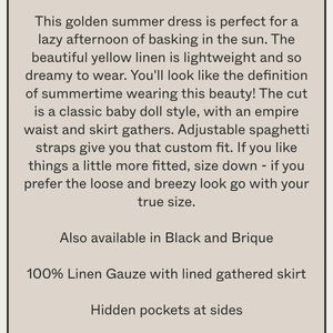 Amanda Moss "Maisy" dress - Linen, knee length, with spaghetti straps - colour "golden", made in Canada. Excellent condition.